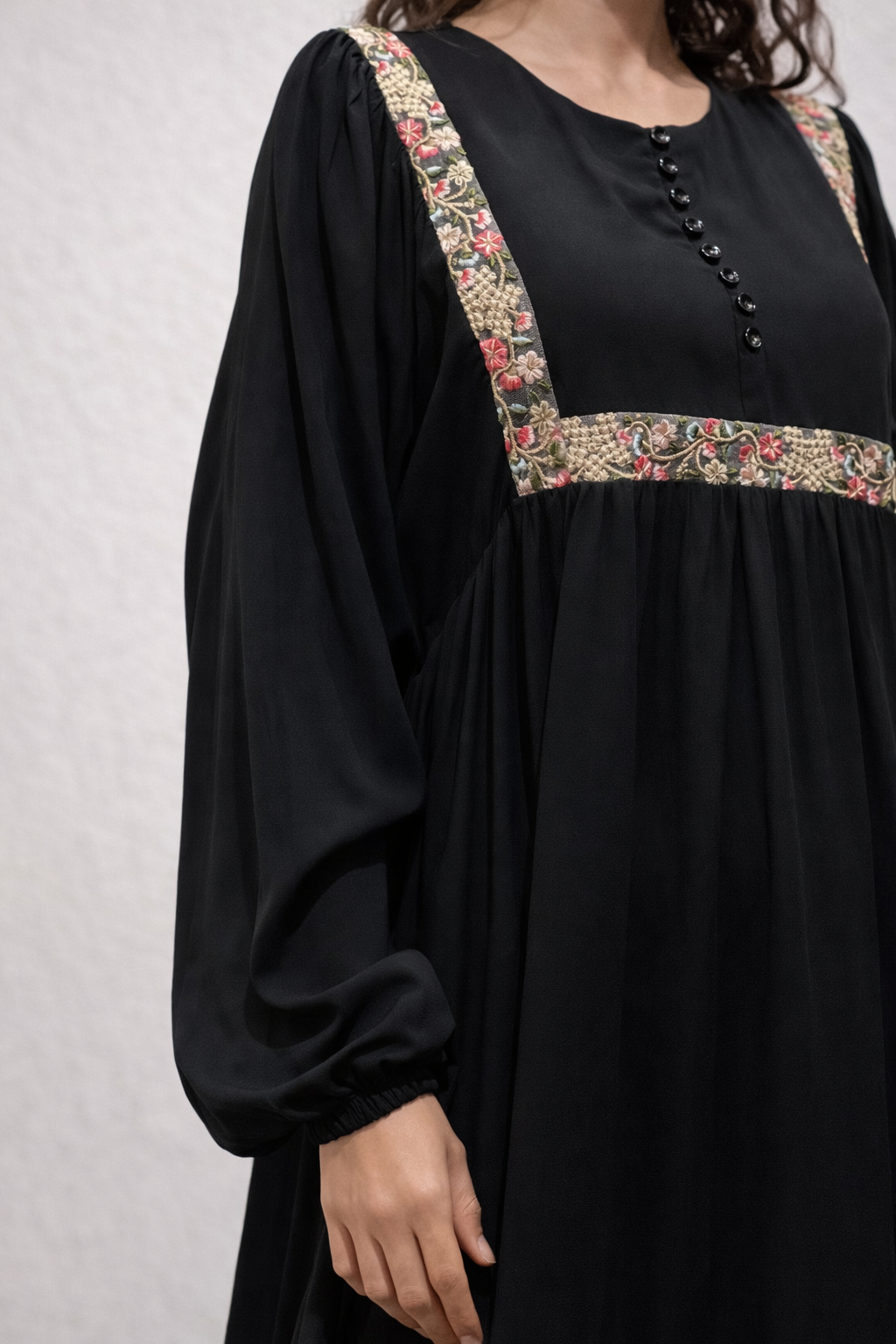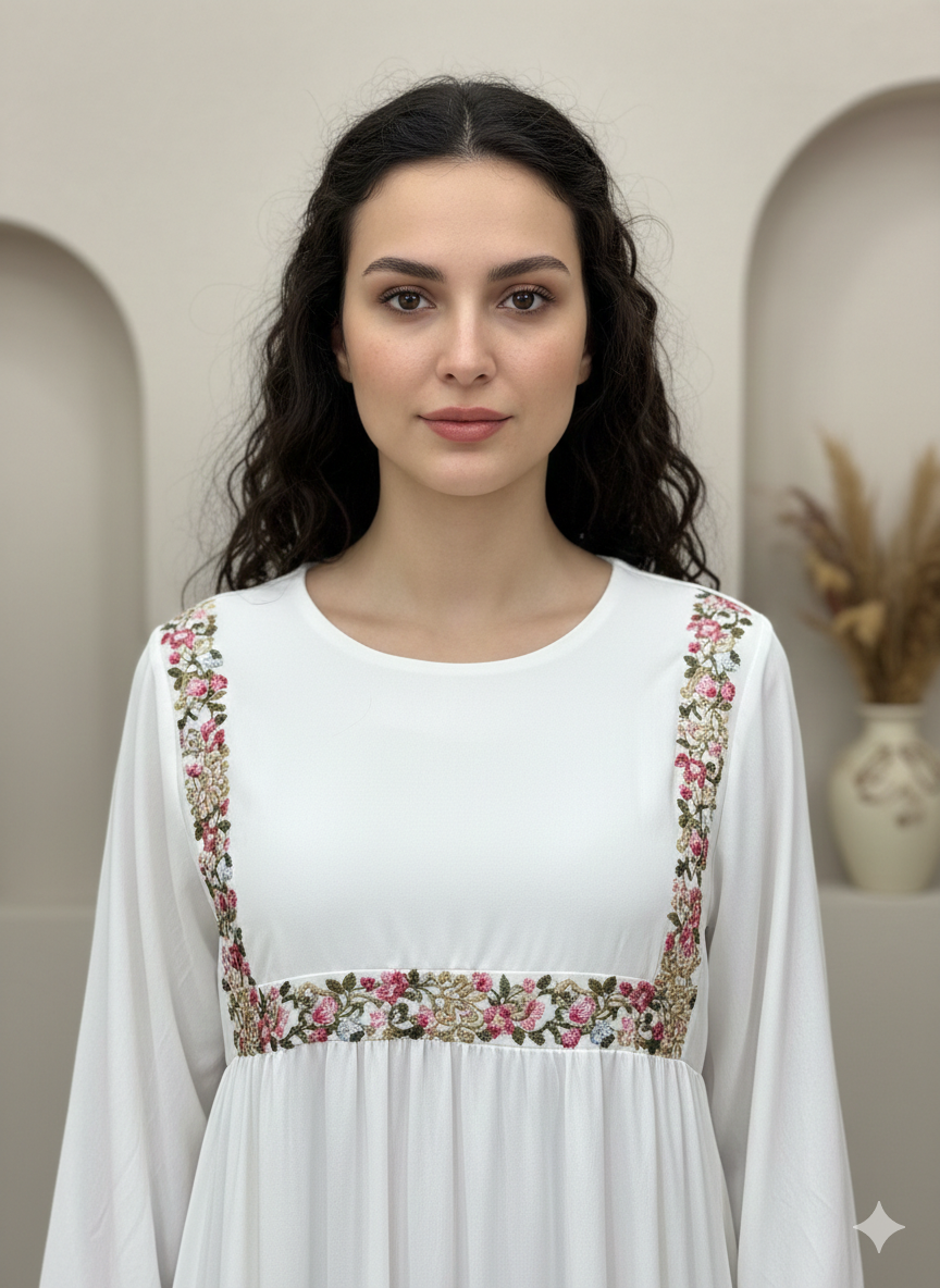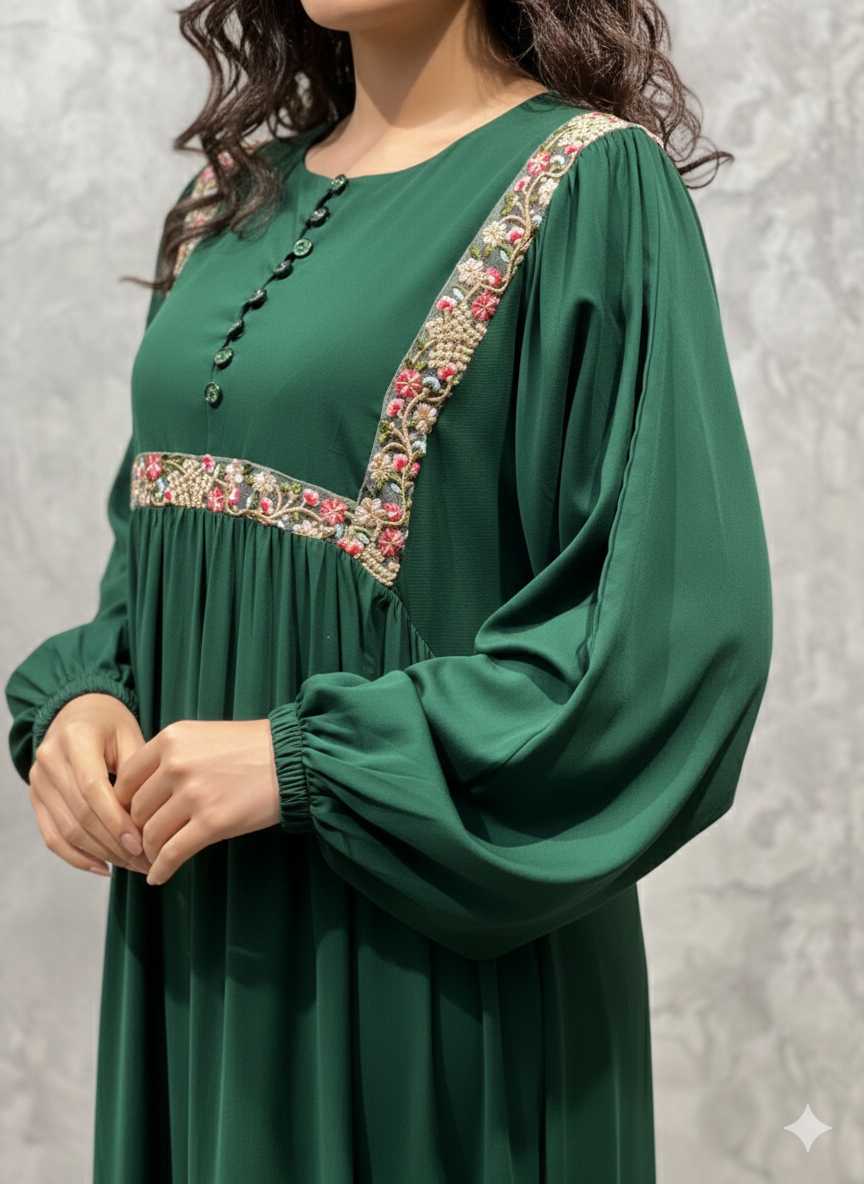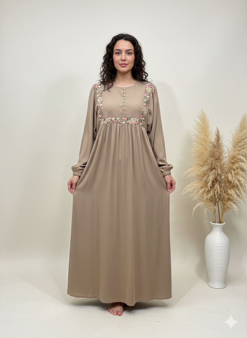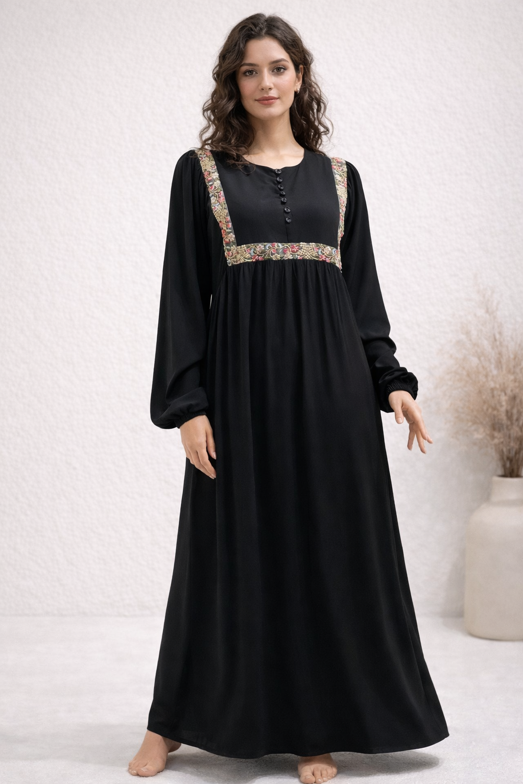 Ushbu ayollar uchun mo‘ljallangan qora abaya zamonaviy va nafis dizayni bilan ajralib turadi. Old qismidagi va yenglaridagi chiroyli kashta naqshlari kiyimga o‘ziga xos joziba bag‘ishlaydi. Kundalik kiyimda ham, maxsus tadbirlarda ham kiyish uchun juda qulay.