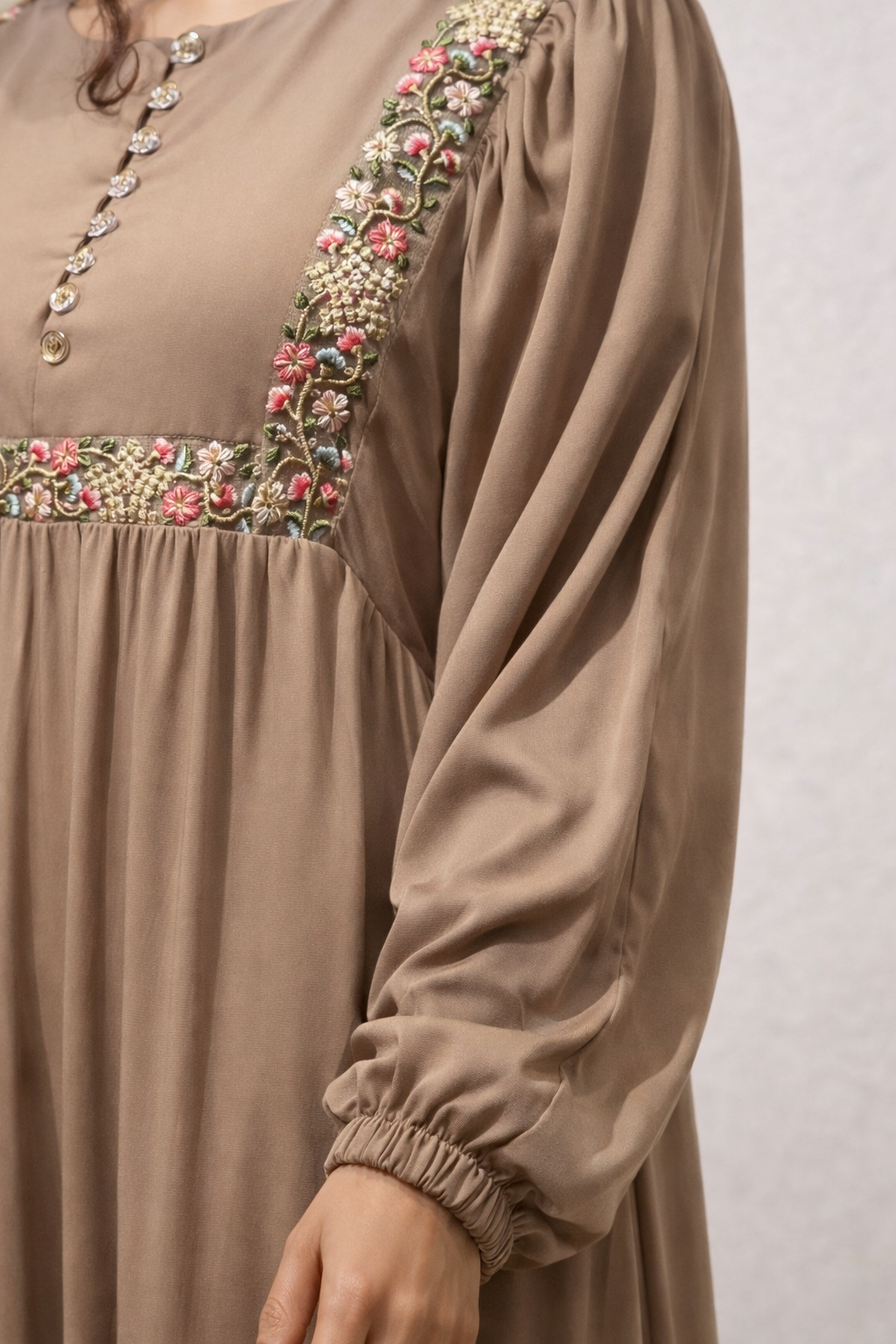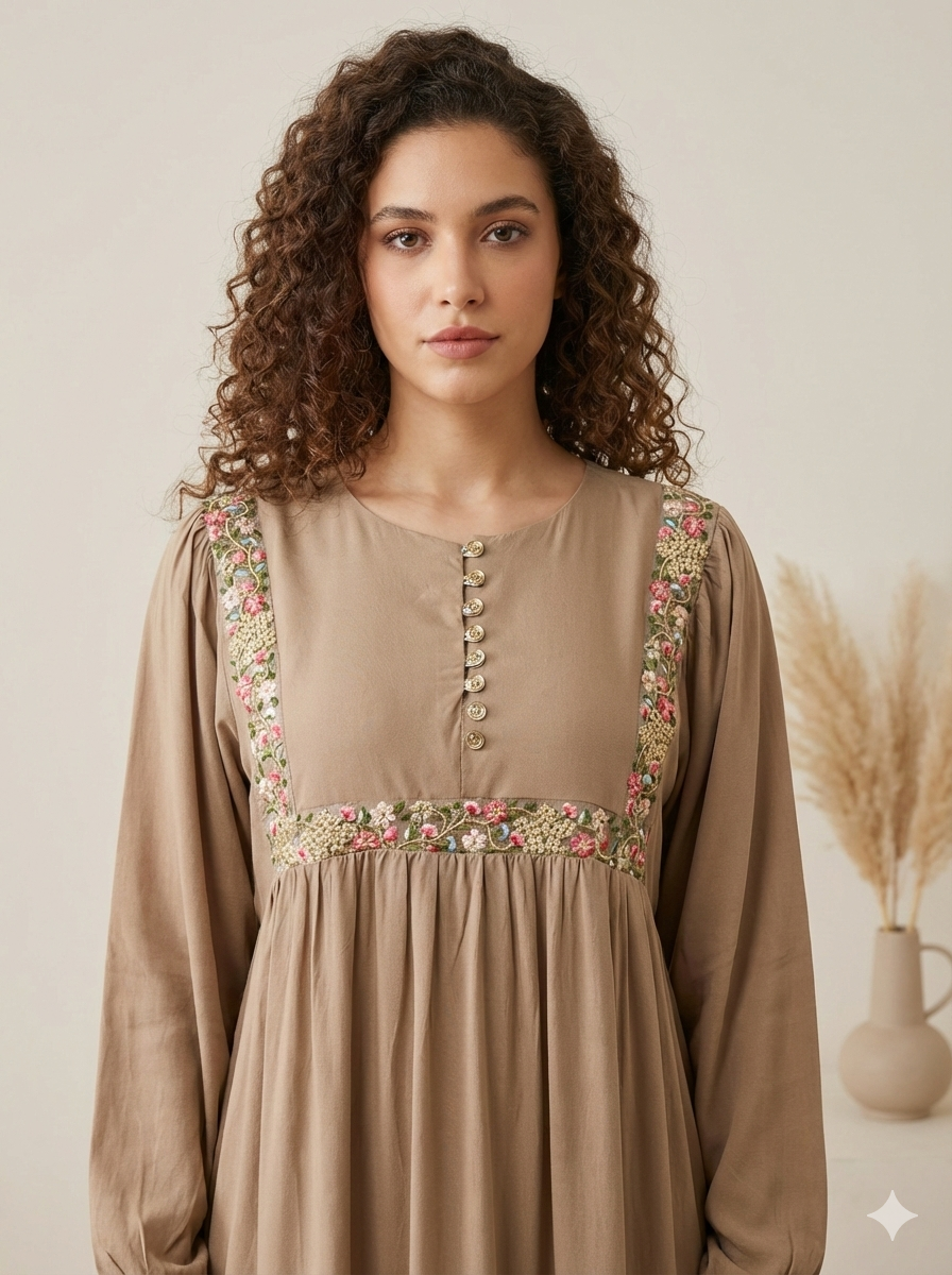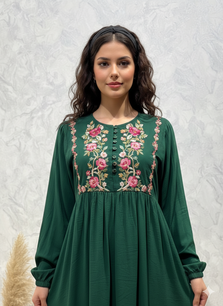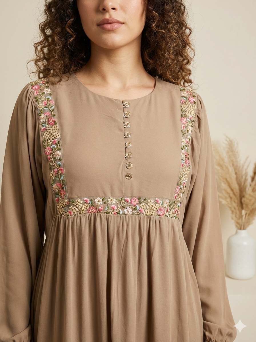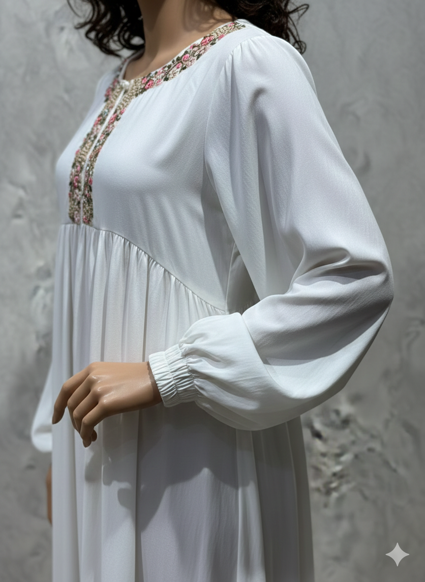 Ushbu ayollar uchun mo‘ljallangan qora abaya zamonaviy va nafis dizayni bilan ajralib turadi. Old qismidagi va yenglaridagi chiroyli kashta naqshlari kiyimga o‘ziga xos joziba bag‘ishlaydi. Kundalik kiyimda ham, maxsus tadbirlarda ham kiyish uchun juda qulay.