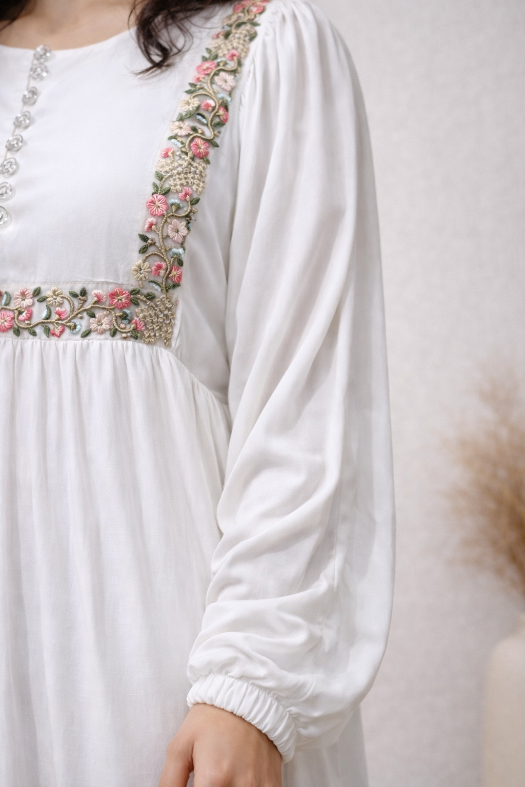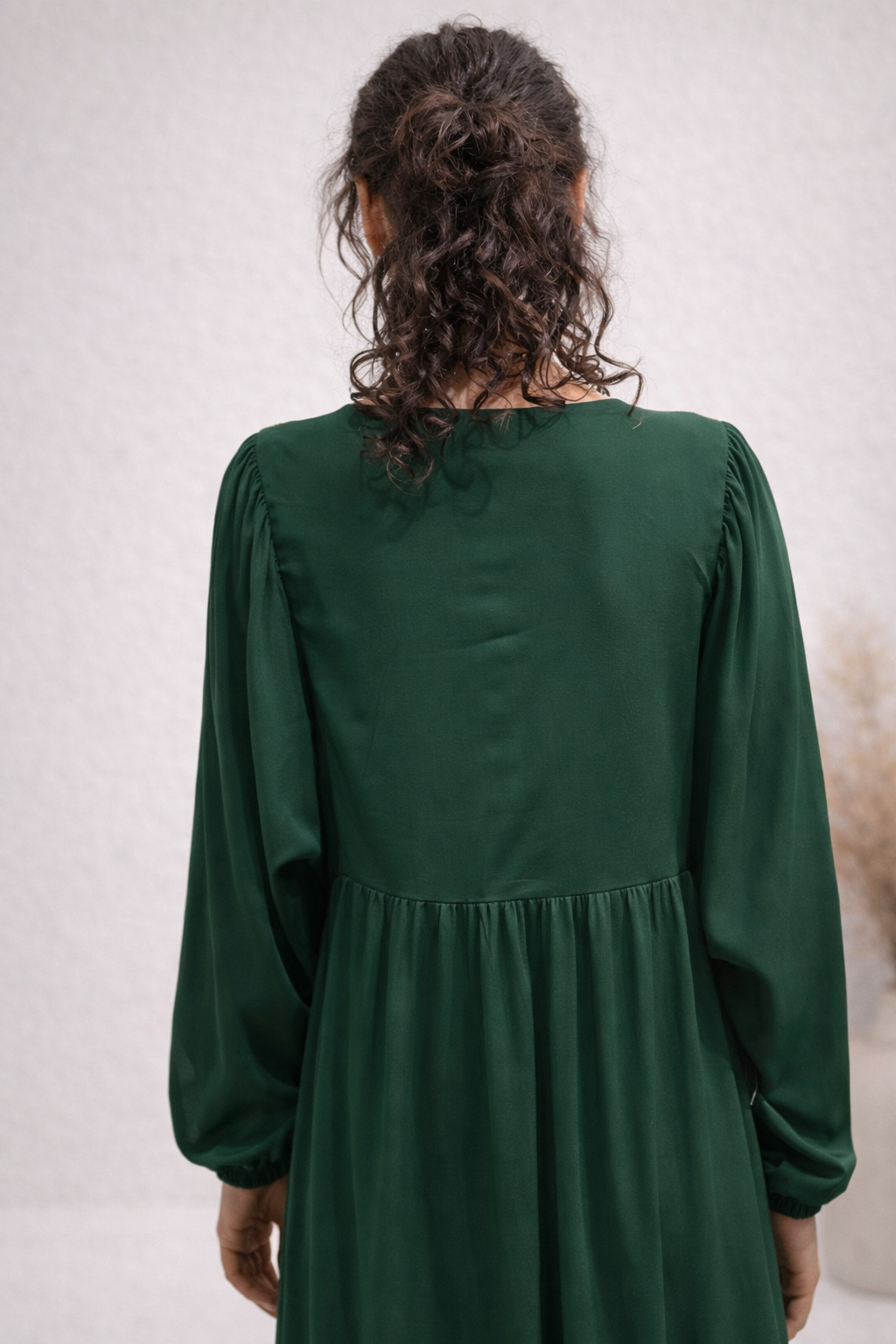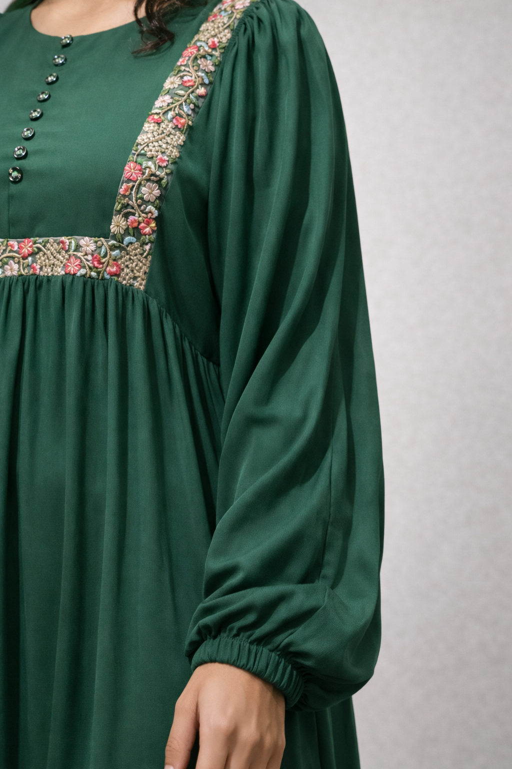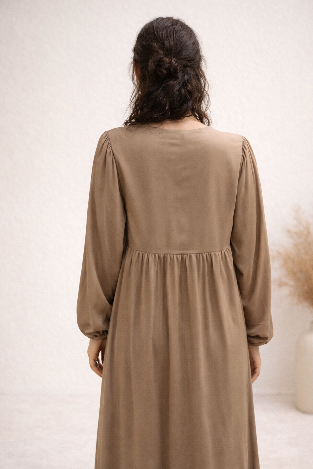 Ushbu ayollar uchun mo‘ljallangan qora abaya zamonaviy va nafis dizayni bilan ajralib turadi. Old qismidagi va yenglaridagi chiroyli kashta naqshlari kiyimga o‘ziga xos joziba bag‘ishlaydi. Kundalik kiyimda ham, maxsus tadbirlarda ham kiyish uchun juda qulay.