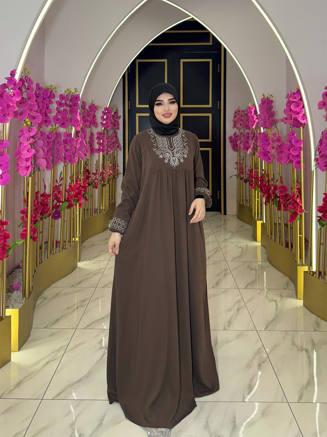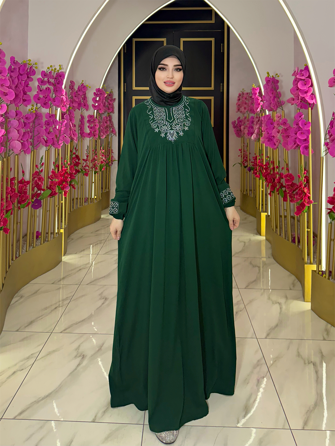 Ushbu ayollar uchun mo‘ljallangan qora abaya zamonaviy va nafis dizayni bilan ajralib turadi. Old qismidagi va yenglaridagi chiroyli kashta naqshlari kiyimga o‘ziga xos joziba bag‘ishlaydi. Kundalik kiyimda ham, maxsus tadbirlarda ham kiyish uchun juda qulay.